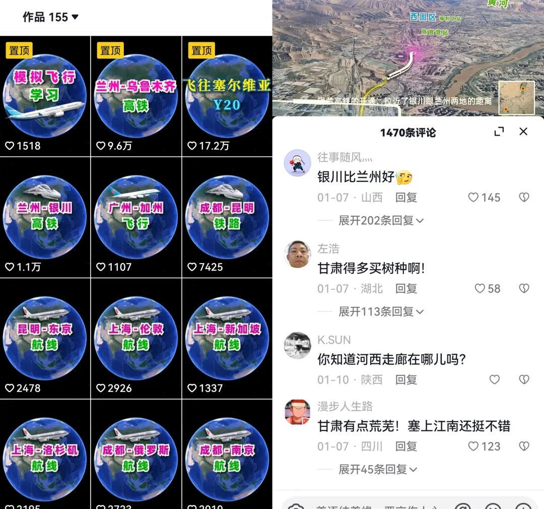 视频其实就是用谷歌地球模拟高铁路线,去介绍每一站城市风土人情,比如景点、美食之类的,这种内容对于三年来一直宅在家里的人来说,有一种身临其境的代入感,尤其是五一节假日快到了,很多人都会趁着春暖花开出去看看,坐上高铁,刷到这些内容就会很有吸引力。