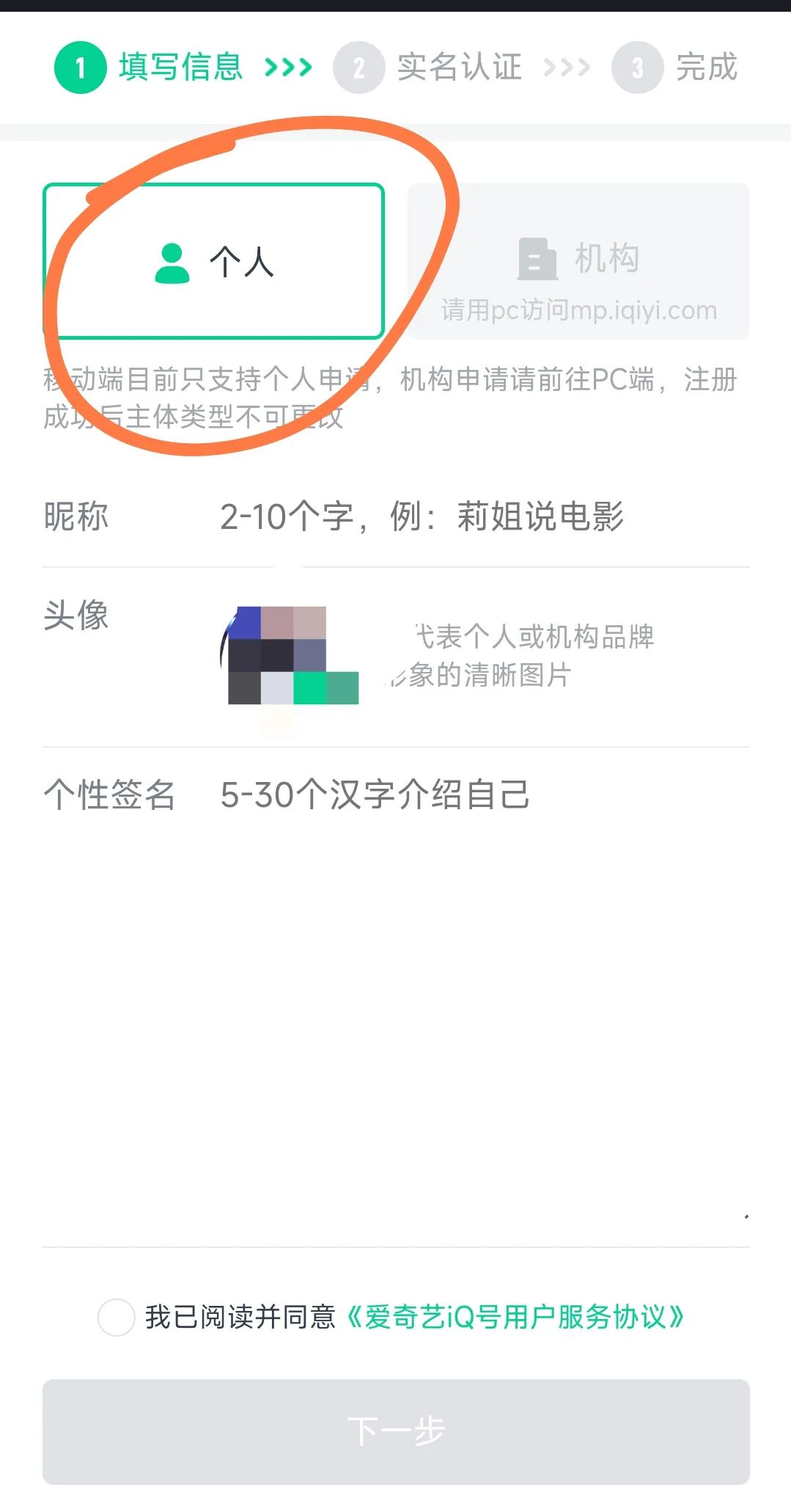 选择个人,名字和个人剪辑填写一下,越详细越好,名字就弄一个和你要做的领域相关的,例如我想做影视剪辑,我就弄一个《敏哥说电影》差不多类似的就行。