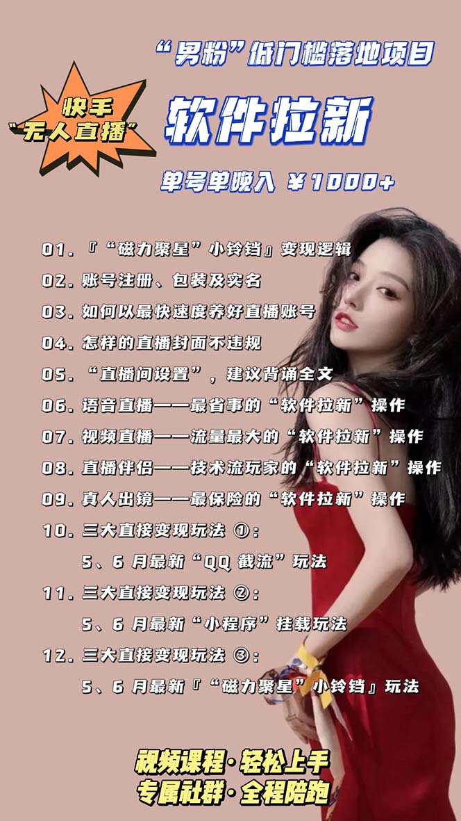 快手0粉开通官方“磁力聚星”小铃铛,0基础0费用实操无人直播“软件拉新”