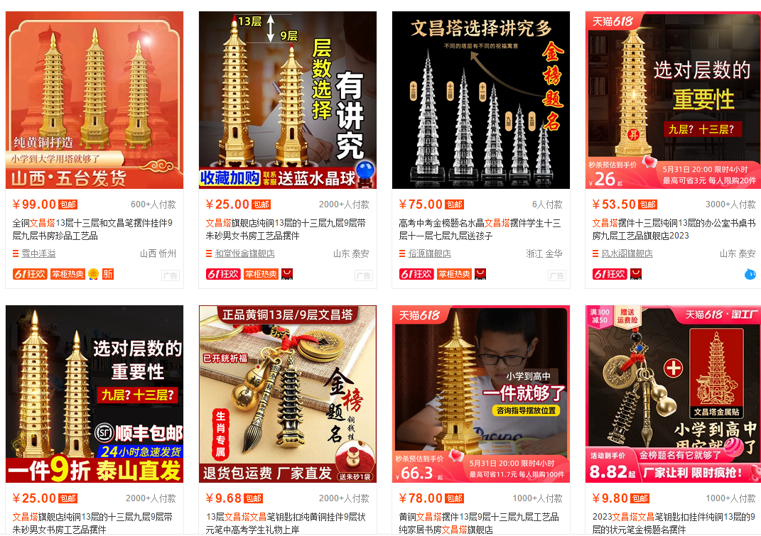 文昌塔算是高考的周边产品,是父母买来送给子女的祈福产品,寓意着步步高升,学业有成,产品的单价在20到50每单,