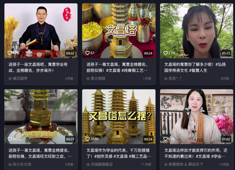 最近一个视频十多秒就可以带货,收益达到上万,带货视频带的就是一种叫文昌塔的小物件,因为还有一周左右就要高考了,