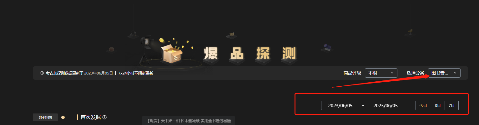 电脑端考古加有爆品探测这个功能,点击进入后,先设置好搜索筛选的范围,选择自己的赛道,时间就设置为当天。