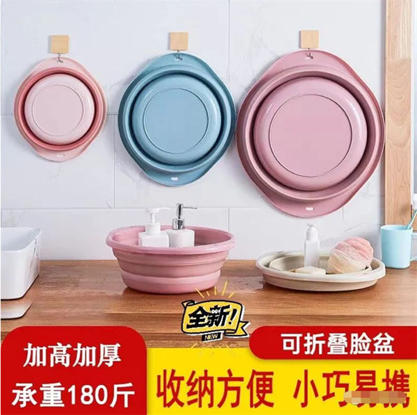 1、大小有参照,很多人平常多几公分没有概念,第一张脸盆下面有沐浴露有杯子做参照物,大中小号的脸盆挂在上面大家一看心里就有数。