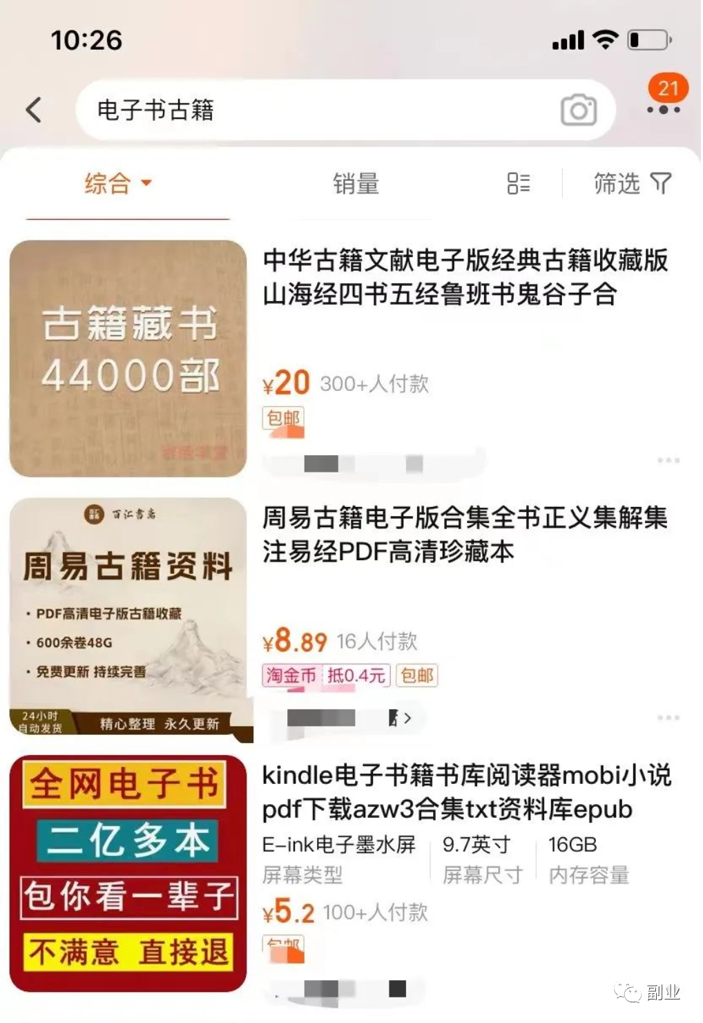 直接搜索古籍电子书,第一个出来的产品确实吓到我了,20块一单,包含40000多部,确实够牛逼! 有时候很多渠道,多搜索下,需要的货源都能找到,确实省了不少事,也能省钱! 发现找这些书,某宝很多店都有卖,连续看了好几家店铺,单价也不高,花个几十块,直接解决掉货源问题! 成本贼低! 贰 古籍老书变现方式? 最直接的变现就是卖书,怎么卖?通过哪些渠道卖?怎么才能赚到钱? 几种方式:卖合集、卖单册、卖收费会员、代找书籍