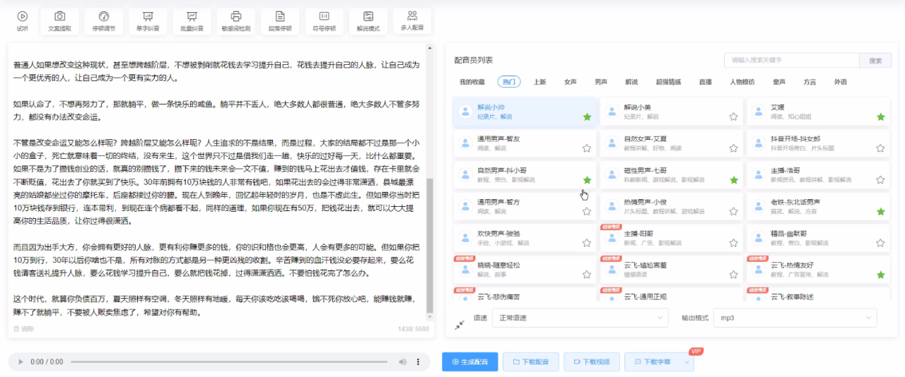 文案获取出来后,第二步就是把文案制作成音频即可,普通话标准的可以自己对着文案边读边录音,如果是为了效率的,可以直接用配音软件把文案一键生成配音。